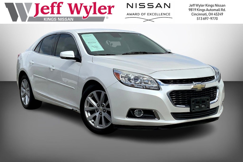 Jeff Wyler Kings Nissan is honored to offer this great-looking 2015 Chevrolet Malibu LT in Iridescent Pearl Tricoat. Well equipped with: Electronics & Entertainment Package (120-Volt Power Outlet, Body-Color Bodyside Moldings, Inside Rear-View Auto-Dimming Mirror, Pioneer Premium 9-Speaker System, Rear Vision Camera, Trunk Cargo Convenience Net, and Universal Home Remote), Leather Package (Heated Driver & Front Passenger Seats and Leather-Appointed Seat Trim), Preferred Equipment Group 2LT, Cocoa/Light Neutral Leather, 18" Aluminum Wheels, 4-Way Manual Front Passenger Seat Adjuster, 4-Wheel Disc Brakes, 6 Speakers, 7" Diagonal Touch-Screen Color Display, ABS brakes, Air Conditioning, Alloy wheels, AM/FM radio: SiriusXM, AM/FM Stereo w/CD Player & MP3 Playback, Automatic temperature control, Brake assist, Bumpers: body-color, CD player, Chevrolet MyLink, Compass, Delay-off headlights, Driver 8-Way Power Seat Adjuster, Driver door bin, Driver Power Lumbar Seat Adjuster, Driver vanity mirror, Dual front impact airbags, Dual front side impact airbags, Electronic Stability Control, Emergency communication system: OnStar Directions & Connections, Four wheel independent suspension, Front anti-roll bar, Front Bucket Seats, Front Center Armrest w/Storage, Front dual zone A/C, Front fog lights, Front reading lights, Fully automatic headlights, Heated door mirrors, Illuminated entry, Knee airbag, Leather Shift Knob, Low tire pressure warning, Occupant sensing airbag, Outside temperature display, Overhead airbag, Overhead console, Panic alarm, Passenger door bin, Passenger vanity mirror, Power door mirrors, Power driver seat, Power steering, Power windows, Premium Cloth/Leatherette Seat Trim, Radio data system, Rear anti-roll bar, Rear reading lights, Rear seat center armrest, Rear side impact airbag, Rear window defroster, Remote keyless entry, Security system, SiriusXM Satellite Radio, Speed control, Split folding rear seat, Steering wheel mounted audio controls, Tachometer, Telescoping steering wheel, Tilt steering wheel, Traction control, Trip computer, Turn signal indicator mirrors, and Variably intermittent wipers.Ask about available certifications.