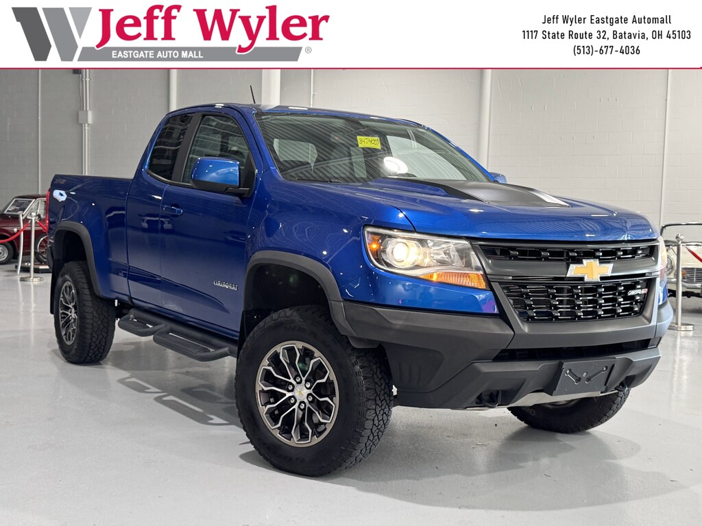 Jeff Wyler Eastgate Auto Mall is pleased to offer this charming 2018 Chevrolet Colorado ZR2 in Kinetic Blue Metallic. Well equipped with: Heavy-Duty Trailering Package, Interior Illumination Package (LPO), Off-Road Appearance Package, Preferred Equipment Group 4ZR (Black Rear Bumpers, Black Spray-On Bedliner w/Chevrolet Logo, Driver-Selectable Full-Locking Front Differential, Driver-Selectable Full-Locking Rear Differential, and Integrated Trailer Brake Controller), Premium Interior Package (LPO) (All-Weather Floor Liner (LPO) (AAK)), 17" x 8" Aluminum Wheels, 3.42 Rear Axle Ratio, 4-Way Power Front Passenger Seat Adjuster, 4-Wheel Disc Brakes, 6 Speakers, 6-Speaker Audio System Feature, ABS brakes, Air Conditioning, Alloy wheels, AM/FM radio: SiriusXM, Apple CarPlay, Auto-dimming Rear-View mirror, Automatic temperature control, Bose Premium 7-Speaker Audio System Feature, Compass, Delay-off headlights, Driver 4-Way Power Seat Adjuster, Driver door bin, Driver vanity mirror, Dual front impact airbags, Dual front side impact airbags, Electronic Stability Control, Exterior Parking Camera Rear, Front anti-roll bar, Front Bucket Seats, Front Center Armrest, Front fog lights, Front License Plate Kit, Front reading lights, Front wheel independent suspension, Fully automatic headlights, Heated door mirrors, Heated Driver & Front Passenger Seats, Heated front seats, Hitch Guidance, Illuminated entry, Leather-Appointed Seat Trim, Low tire pressure warning, Occupant sensing airbag, Outside temperature display, Overhead airbag, Overhead console, Panic alarm, Passenger door bin, Passenger vanity mirror, Power door mirrors, Power Driver Lumbar Control Seat Adjuster, Power driver seat, Power Passenger Lumbar Control Seat Adjuster, Power passenger seat, Power steering, Power windows, Premium audio system: Chevrolet MyLink, Radio data system, Radio: AM/FM Stereo w/8" Diagonal Color Touch Nav., Radio: AM/FM Stereo w/8" Diagonal Color Touch Screen, Rear step bumper, Rear window defroster, Remote keyless entry, Security system, SiriusXM Satellite Radio, Speed control, Speed-sensing steering, Split folding rear seat, Steering wheel mounted audio controls, Tachometer, Telescoping steering wheel, Tilt steering wheel, Tow/Haul Mode, Traction control, Trip computer, and Variably intermittent wipers. Clean CARFAX. Awards: * 2018 KBB.com Best Resale Value Awards * 2018 KBB.com 10 Most Awarded Brands Ask about available certifications. Used vehicles 10 years of age or newer with less than 100,000 miles are eligible for the Wyler Assurance Program, but eligible vehicles must pass our reconditioning process and multi-point inspection. Provided the vehicle passes inspection, vehicles will be eligible for the 6 month/6,000 mile limited warranty. The 6 month/6,000 mile limited warranty is NOT available on AS-IS vehicles, wholesale vehicles, lease buyback/pass-thru vehicles or un-inspected vehicles. Note that this program can also apply to vehicles where the remaining factory coverage is less than 6 months or 6,000 miles. Please check the Federal Trade Commission (FTC) Buyers guide on the vehicle for full details as to whether or not warranty coverage may apply. Contact Dealer for additional details. The Wyler Assurance 6 month/6,000 Mile limited warranty ends 6 months from the date of the Retail Purchase Agreement (BUYERS ORDER) or when the vehicle's odometer registers 6,000 additional miles to the mileage listed on the BUYERS ORDER, whichever comes first. Your Deductible - The warranty holder on your contract pays the first $100 of each covered repair.