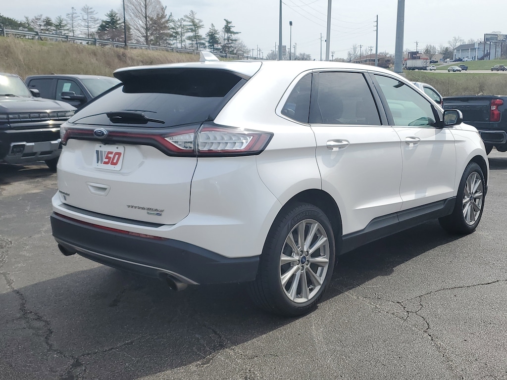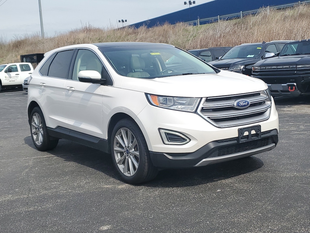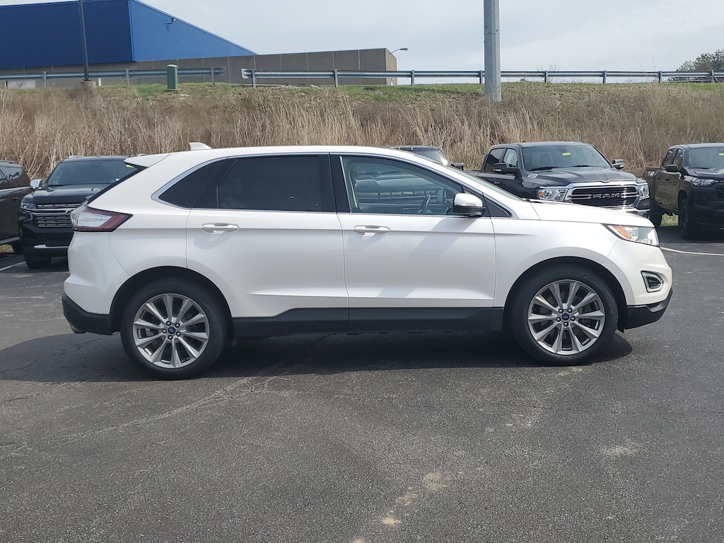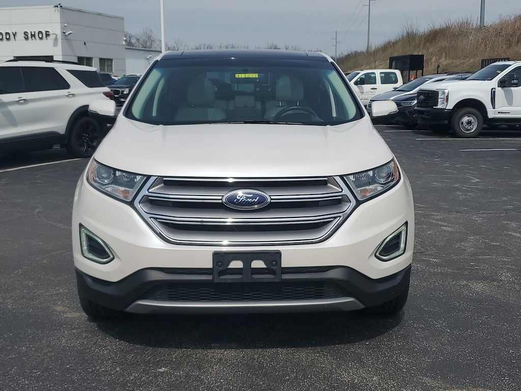 Jeff Wyler Florence Buick GMC is pleased to offer this gorgeous 2017 Ford Edge Titanium in White Platinum. Cold Weather Package (Front & Rear Floor Liners and Heated Steering Wheel), Equipment Group 301A (Heated Rear-Seats, Panoramic Vista Roof, and Perforated Leather Trimmed Heated/Cooled Buckets), Technology Package (110V/400W AC Power Outlet, Auto-Dimming Driver's Sideview Mirror, BLIS Blind Spot Information System, Radio: AM/FM Stereo w/Single CD/Navigation, Remote Start System, SiriusXM Radio, and SiriusXM Traffic & Travel Link), 12 Speakers, 4-Wheel Disc Brakes, ABS brakes, Air Conditioning, Alloy wheels, AM/FM radio: SiriusXM, AM/FM Stereo w/Single CD Player, Auto-dimming Rear-View mirror, Automatic temperature control, Axle Ratio: TBD, Brake assist, Bumpers: body-color, CD player, Compass, Delay-off headlights, Driver door bin, Driver vanity mirror, Dual front impact airbags, Dual front side impact airbags, Electronic Stability Control, Emergency communication system: SYNC 3 911 Assist, Exterior Parking Camera Rear, Four wheel independent suspension, Front anti-roll bar, Front Bucket Seats, Front Center Armrest w/Storage, Front dual zone A/C, Front reading lights, Fully automatic headlights, Garage door transmitter, Heated door mirrors, Heated front seats, Illuminated entry, Knee airbag, Leather Shift Knob, Leather-Trimmed Heated Sport Bucket Seats, Low tire pressure warning, Memory seat, Occupant sensing airbag, Outside temperature display, Overhead airbag, Overhead console, Panic alarm, Passenger door bin, Passenger vanity mirror, Power door mirrors, Power driver seat, Power Liftgate, Power passenger seat, Power steering, Power windows, Premium audio system: Sony, Rear anti-roll bar, Rear Parking Sensors, Rear reading lights, Rear seat center armrest, Rear window defroster, Rear window wiper, Remote keyless entry, Security system, Speed control, Speed-Sensitive Wipers, Split folding rear seat, Spoiler, Steering wheel mounted audio controls, SYNC 3, Tachometer, Telescoping steering wheel, Tilt steering wheel, Traction control, Trip computer, Turn signal indicator mirrors, Variably intermittent wipers, Wheels: 19 Nickel-Painted Aluminum, and Wheels: 20 Premium Polished Aluminum Our PRE-OWNED vehicles are put through a rigorous 167- POINT QUALITY ASSURANCE INSPECTION along with an average amount of over $1,400.00 SPENT to recondition each vehicle so we can be sure to deliver you the highest quality vehicle like you deserve! ***ONLINE PRICE DOES NOT INCLUDE WYLER FAMILY FIRST PACKAGE*** Stop by 1154 Burlington Pike Florence KY 41402to see for yourself, or give us a call @ 859-525-8001 to schedule your test drive!