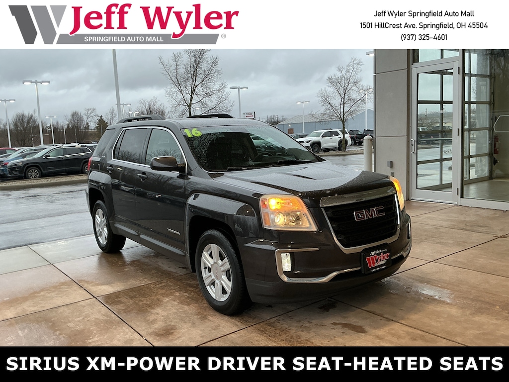 Jeff Wyler Springfield Auto Mall is pleased to offer this gorgeous 2016 GMC Terrain SLE-2 in Iridium Metallic. Well equipped with: Convenience Package (Heated Driver & Front Passenger Seats and Remote Vehicle Start), GMC Interior Protection Package (LPO) (All-Weather Floor Mats and Black All-Weather Rear Cargo Mat (LPO)), Preferred Equipment Group 3SB (Intellilink w/Bluetooth and Single-Zone Automatic Climate Control), 155 Amp Alternator, 17" x 7" Aluminum Wheels, 4-Wheel Disc Brakes, 8 Speakers, 8-Way Power Driver Seat Adjuster, ABS brakes, Air Conditioning, Alloy wheels, AM/FM radio: SiriusXM, Auto-dimming Rear-View mirror, Automatic temperature control, Brake assist, Bumpers: body-color, Compass, Delay-off headlights, Driver door bin, Driver vanity mirror, Dual Exhaust w/Premium Tips, Dual front impact airbags, Dual front side impact airbags, E10 Fuel Capable, Electronic Stability Control, Emergency communication system, Exterior Parking Camera Rear, Four wheel independent suspension, Front anti-roll bar, Front Bucket Seats, Front Center Armrest, Front License Plate Bracket, Front reading lights, Fully automatic headlights, Heated door mirrors, Illuminated entry, Low tire pressure warning, Occupant sensing airbag, Outside temperature display, Overhead airbag, Panic alarm, Passenger door bin, Passenger vanity mirror, Pioneer Premium 8-Speaker System, Power door mirrors, Power driver seat, Power steering, Power windows, Premium Cloth Seat Trim, Radio data system, Radio: Color Touch AM/FM Stereo, Rear anti-roll bar, Rear seat center armrest, Rear window defroster, Rear window wiper, Remote keyless entry, Roof rack: rails only, Security system, SiriusXM Satellite Radio, Speed control, Speed-sensing steering, Split folding rear seat, Spoiler, Steering wheel mounted audio controls, Tachometer, Telescoping steering wheel, Tilt steering wheel, Traction control, Trip computer, and Variably intermittent wipers. Awards: * JD Power Initial Quality Study (IQS) * 2016 IIHS Top Safety Pick * 2016 IIHS Top Safety Pick with optional front crash prevention * 2016 KBB.com Brand Image Awards Reviews: * Powerful available V6 engine; quiet interior; comfortable highway ride; spacious and adjustable backseat. Source: EdmundsAsk about available certifications. Used vehicles 10 years of age or newer with less than 100,000 miles are eligible for the Wyler Assurance Program, but eligible vehicles must pass our reconditioning process and multi-point inspection. Provided the vehicle passes inspection, vehicles will be eligible for the 6 month/6,000 mile limited warranty. The 6 month/6,000 mile limited warranty is NOT available on AS-IS vehicles, wholesale vehicles, lease buyback/pass-thru vehicles or un-inspected vehicles. Note that this program can also apply to vehicles where the remaining factory coverage is less than 6 months or 6,000 miles. Please check the Federal Trade Commission (FTC) Buyers guide on the vehicle for full details as to whether or not warranty coverage may apply. Contact Dealer for additional details. The Wyler Assurance 6 month/6,000 Mile limited warranty ends 6 months from the date of the Retail Purchase Agreement (BUYERS ORDER) or when the vehicle's odometer registers 6,000 additional miles to the mileage listed on the BUYERS ORDER, whichever comes first. Your Deductible - The warranty holder on your contract pays the first $100 of each covered repair.