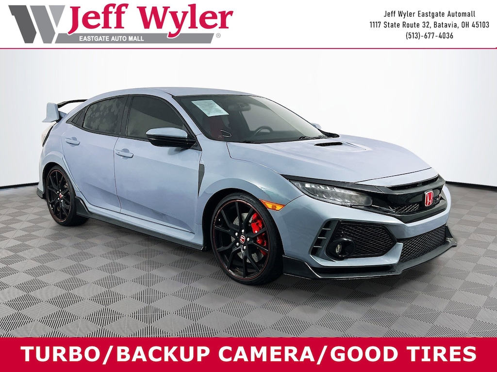 Jeff Wyler Eastgate Auto Mall is pleased to offer this charming 2019 Honda Civic Type R Touring in Blue. Well equipped with: 12 Speakers, 4-Wheel Disc Brakes, ABS brakes, Adaptive suspension, Air Conditioning, Alloy wheels, AM/FM radio: SiriusXM, Apple CarPlay/Android Auto, Automatic temperature control, Brake assist, Bumpers: body-color, Compass, Delay-off headlights, Driver door bin, Driver vanity mirror, Dual front impact airbags, Dual front side impact airbags, Electronic Stability Control, Exterior Parking Camera Rear, Four wheel independent suspension, Front anti-roll bar, Front Bucket Seats, Front Center Armrest, Front dual zone A/C, Front fog lights, Front reading lights, Fully automatic headlights, Heated door mirrors, High-Bolstered Front Bucket Sport Seats, Illuminated entry, Low tire pressure warning, Navigation System, Occupant sensing airbag, Outside temperature display, Overhead airbag, Panic alarm, Passenger door bin, Passenger vanity mirror, Power door mirrors, Power steering, Power windows, Radio data system, Radio: 540-Watt AM/FM/HD/SiriusXM Premium Audio, Rear anti-roll bar, Rear window defroster, Rear window wiper, Remote keyless entry, Security system, Speed control, Speed-sensing steering, Speed-Sensitive Wipers, Split folding rear seat, Spoiler, Steering wheel mounted audio controls, Suede-Effect Fabric Seating Surfaces w/Type R Logo, Tachometer, Telescoping steering wheel, Tilt steering wheel, Traction control, Trip computer, Turn signal indicator mirrors, Variably intermittent wipers, and Wheels: 20" x 8.5" Alloy. Clean CARFAX. Ask about available certifications. Used vehicles 10 years of age or newer with less than 100,000 miles are eligible for the Wyler Assurance Program, but eligible vehicles must pass our reconditioning process and multi-point inspection. Provided the vehicle passes inspection, vehicles will be eligible for the 6 month/6,000 mile limited warranty. The 6 month/6,000 mile limited warranty is NOT available on AS-IS vehicles, wholesale vehicles, lease buyback/pass-thru vehicles or un-inspected vehicles. Note that this program can also apply to vehicles where the remaining factory coverage is less than 6 months or 6,000 miles. Please check the Federal Trade Commission (FTC) Buyers guide on the vehicle for full details as to whether or not warranty coverage may apply. Contact Dealer for additional details. The Wyler Assurance 6 month/6,000 Mile limited warranty ends 6 months from the date of the Retail Purchase Agreement (BUYERS ORDER) or when the vehicle's odometer registers 6,000 additional miles to the mileage listed on the BUYERS ORDER, whichever comes first. Your Deductible - The warranty holder on your contract pays the first $100 of each covered repair.