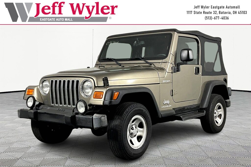 Jeff Wyler Eastgate Auto Mall is delighted to offer this good-looking 2003 Jeep Wrangler Sport in Beige. Well equipped with: 15" x 7" Full Face Steel Wheels, 3.07 Axle Ratio, 4 Speakers, AM/FM Cassette w/Changer Control, AM/FM radio, Cassette, Cloth High-Back Bucket Seats, Driver door bin, Dual front impact airbags, Easy Folding SoftTop, Front anti-roll bar, Front Bucket Seats, Front Center Armrest, Front fog lights, Integrated roll-over protection, Leather steering wheel, Passenger door bin, Power steering, Rear anti-roll bar, Tachometer, Tilt steering wheel, Variably intermittent wipers, and Voltmeter. Awards: * 2003 KBB.com Best Resale Value Awards Ask about available certifications. Used vehicles 10 years of age or newer with less than 100,000 miles are eligible for the Wyler Assurance Program, but eligible vehicles must pass our reconditioning process and multi-point inspection. Provided the vehicle passes inspection, vehicles will be eligible for the 6 month/6,000 mile limited warranty. The 6 month/6,000 mile limited warranty is NOT available on AS-IS vehicles, wholesale vehicles, lease buyback/pass-thru vehicles or un-inspected vehicles. Note that this program can also apply to vehicles where the remaining factory coverage is less than 6 months or 6,000 miles. Please check the Federal Trade Commission (FTC) Buyers guide on the vehicle for full details as to whether or not warranty coverage may apply. Contact Dealer for additional details. The Wyler Assurance 6 month/6,000 Mile limited warranty ends 6 months from the date of the Retail Purchase Agreement (BUYERS ORDER) or when the vehicle's odometer registers 6,000 additional miles to the mileage listed on the BUYERS ORDER, whichever comes first. Your Deductible - The warranty holder on your contract pays the first $100 of each covered repair.