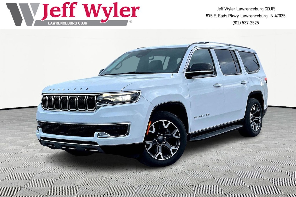 Jeff Wyler Chrysler Dodge Jeep of Lawrenceburg is honored to offer this terrific 2024 Jeep Wagoneer Series III in Bright White Clearcoat. Preferred Equipment Group (DISC) (60/40 Power Recline 3rd Row Seat, Heads-Up Display, Quadra-Lift Air Suspension, and Semi Active Damping), Quick Order Package 25N, 10 Speakers, 3.55 Rear Axle Ratio, 3rd row seats: bench, 4-Wheel Disc Brakes, 8-Passenger Seating, ABS brakes, Adjustable pedals, Air Conditioning, Alloy wheels, AM/FM radio: SiriusXM with 360L, Anti-whiplash front head restraints, Apple CarPlay/Android Auto, Audio memory, Auto High-beam Headlights, Auto-dimming door mirrors, Auto-dimming Rear-View mirror, Auto-leveling suspension, Automatic temperature control, Brake assist, Bumpers: body-color, Compass, Delay-off headlights, Driver door bin, Driver vanity mirror, Driver's Seat Mounted Armrest, Dual front impact airbags, Dual front side impact airbags, Electronic Stability Control, Emergency communication system: Wagoneer Connect, Exterior Parking Camera Rear, Four wheel independent suspension, Front anti-roll bar, Front Bucket Seats, Front Center Armrest w/Storage, Front dual zone A/C, Front fog lights, Front reading lights, Fully automatic headlights, Garage door transmitter, Genuine wood console insert, Genuine wood dashboard insert, Genuine wood door panel insert, Heated door mirrors, Heated front seats, Heated rear seats, Heated steering wheel, Illuminated entry, Knee airbag, Leather Trimmed Bucket Seats, Low tire pressure warning, Memory seat, Navigation System, Normal Duty Suspension, Occupant sensing airbag, Outside temperature display, Overhead airbag, Overhead console, Panic alarm, Passenger door bin, Passenger seat mounted armrest, Passenger vanity mirror, Pedal memory, Power adjustable front head restraints, Power door mirrors, Power driver seat, Power Liftgate, Power passenger seat, Power steering, Power windows, Radio data system, Radio: Uconnect 5 Nav w/10.1" Display, Rain sensing wipers, Rear air conditioning, Rear anti-roll bar, Rear dual zone A/C, Rear reading lights, Rear seat center armrest, Rear window defroster, Rear window wiper, Reclining 3rd row seat, Remote keyless entry, Security system, Speed control, Speed-sensing steering, Speed-Sensitive Wipers, Split folding rear seat, Steering wheel memory, Steering wheel mounted audio controls, Tachometer, Telescoping steering wheel, Tilt steering wheel, Traction control, Trip computer, Turn signal indicator mirrors, Variably intermittent wipers, Ventilated front seats, Voltmeter, and Wheels: 20" x 9.0" Aluminum (DISC) Our PRE-OWNED vehicles are put through a rigorous 167- POINT QUALITY ASSURANCE INSPECTION along with an average amount of over $1,400.00 SPENT to recondition each vehicle so we can be sure to deliver you the highest quality vehicle like you deserve! ***ONLINE PRICE DOES NOT INCLUDE WYLER FAMILY FIRST PACKAGE*** Stop by 4136 Shelbyville Road to see for yourself, or give us a call @ 502-897-3151 to schedule your test drive! Ask about available certifications.