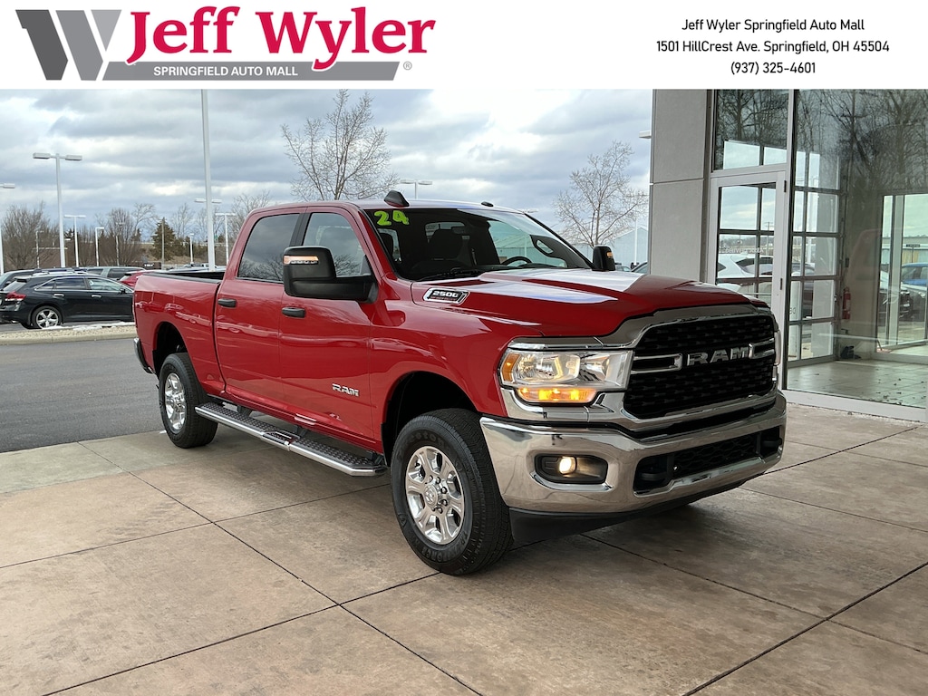 Jeff Wyler Springfield Auto Mall is very proud to offer this handsome 2024 Ram 2500 Big Horn in Flame Red Clearcoat. Well equipped with: Bed Utility Group (LED Bed Lighting, MOPAR Deployable Bed Step, and MOPAR Spray In Bedliner), Level 1 Equipment Group (2 Way Rear Headrest Seat, 2nd Row In Floor Storage Bins, 4 Way Front Headrests, 40/20/40 Split Bench Seat, 4G LTE Wi-Fi Hot Spot, 8.4" Touchscreen Display, Apple CarPlay, Auto Power-Folding Mirrors, Big Horn IP Badge, Black Exterior Mirrors, Bluetooth Handsfree Phone & Audio, Center Hub, Connectivity - US/Canada, Dual Glove Boxes, Exterior Mirrors Courtesy Lamps, Exterior Mirrors w/Heating Element, Exterior Mirrors w/Supplemental Signals, Foam Bottle Insert (Door Trim Panel), Footwell Courtesy Lamp, For Details, Visit DriveUconnect.com, For More Info, Call 800-643-2112, Forward & Reverse Utility Lights, Front Armrest w/Cupholders, Front Center Seat Cushion Storage, Front Fog Lamps, Front Seat Back Map Pockets, Global Telematics Box Module (TBM), Glove Box Lamp, Google Android Auto, GPS Antenna Input, Integrated Center Stack Radio, Integrated Voice Command w/Bluetooth, Leather Wrapped Steering Wheel, Locking Lower Glove Box, Manual Adjust 4-Way Front Passenger Seat, Mirror Running Lights, Power 2-Way Driver Lumbar Adjust, Power Adjust 8-Way Driver Seat, Power Adjust Mirrors, Power Adjustable Convex Aux Mirrors, Power Heated Fold Telescope Mirrors, Power Telescoping Mirrors, Rear 60/40 Folding Seat, Rear Dome w/On/Off Switch Lamp, Remote USB Port - Charge Only, Selectable Tire Fill Alert, SiriusXM Radio Service, SiriusXM Satellite Radio, Steering Wheel Mounted Audio Controls, Storage Tray, and Wheels: 18" x 8.0" Polished Aluminum), Protection Group (Tow Hooks), Quick Order Package 2GZ Big Horn, 3.73 Axle Ratio, 4-Wheel Disc Brakes, 6 Speakers, 9 Alpine Speakers w/Subwoofer, ABS brakes, Active Noise Control System, Air Conditioning, Anti-Spin Differential Rear Axle, Brake assist, Bumpers: chrome, Center Stack Storage Drawer, Chrome Flat Wheel-to-Wheel Side Steps, Cloth 40/20/40 Bench Seat, Compass, Delay-off headlights, Driver door bin, Dual front impact airbags, Dual front side impact airbags, Electronic Stability Control, Electronically Controlled Throttle, Emergency communication system: SiriusXM Guardian, Front anti-roll bar, Front Center Armrest w/Storage, Front License Plate Bracket, Front reading lights, Fully automatic headlights, Heated door mirrors, Illuminated entry, Low tire pressure warning, Manual Adjust 4-Way Driver Seat, Manufacturer's Statement of Origin, Occupant sensing airbag, Outside temperature display, Overhead airbag, Overhead console, Panic alarm, ParkView Rear Back-Up Camera, Passenger door bin, Passenger vanity mirror, Power door mirrors, Power steering, Power windows, Premium Cloth 40/20/40 Bench Seat (DISC), Radio data system, Radio: Uconnect 3 w/5" Display, Radio: Uconnect 5 W w/8.4" Display, Rear anti-roll bar, Rear Folding Seat, Rear seat center armrest, Rear step bumper, Remote keyless entry, Speed control, Tachometer, Tilt steering wheel, Tip Start, Traction control, Trip computer, Turn signal indicator mirrors, Variably intermittent wipers, Voltmeter, and Wheels: 18" x 8.0" Steel Chrome ClaD. Ask about available certifications. Used vehicles 10 years of age or newer with less than 100,000 miles are eligible for the Wyler Assurance Program, but eligible vehicles must pass our reconditioning process and multi-point inspection. Provided the vehicle passes inspection, vehicles will be eligible for the 6 month/6,000 mile limited warranty. The 6 month/6,000 mile limited warranty is NOT available on AS-IS vehicles, wholesale vehicles, lease buyback/pass-thru vehicles or un-inspected vehicles. Note that this program can also apply to vehicles where the remaining factory coverage is less than 6 months or 6,000 miles. Please check the Federal Trade Commission (FTC) Buyers guide on the vehicle for full details as to whether or not warranty coverage may ap