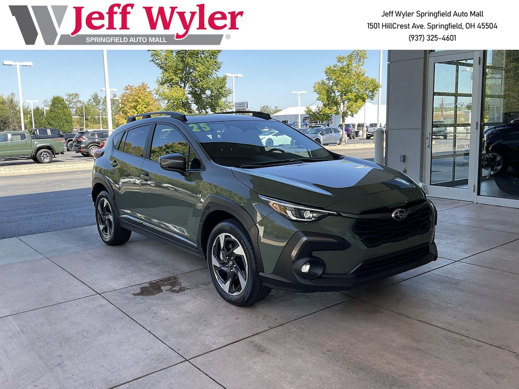Jeff Wyler Springfield Auto Mall is pumped up to offer this superb 2025 Subaru Crosstrek Limited in Alpine Green. Well equipped with: Crosstrek Mirror Package (Auto-Dimming Exterior Mirror w/Approach Light and Auto-Dimming Mirror w/Compass & HomeLink), H/K Speaker System & Power Moonroof & Navigation (harman/kardon Surround Sound Speaker System, Power Moonroof, and Radio: Subaru 11.6" Multimedia Nav System), 4-Wheel Disc Brakes, 6 Speakers, ABS brakes, Air Conditioning, All-Weather Floor Liners, Alloy wheels, AM/FM radio: SiriusXM, Anti-whiplash front head restraints, Auto High-beam Headlights, Automatic temperature control, Brake assist, Bumpers: body-color, Driver door bin, Driver vanity mirror, Dual front impact airbags, Dual front side impact airbags, Electronic Stability Control, Emergency communication system, Exterior Parking Camera Rear, Four wheel independent suspension, Front anti-roll bar, Front Bucket Seats, Front Center Armrest, Front dual zone A/C, Front fog lights, Front reading lights, Fully automatic headlights, Heated door mirrors, Heated Front Bucket Seats, Heated front seats, Illuminated entry, Knee airbag, Leather Shift Knob, Leather steering wheel, Leather-Trimmed Upholstery, LED Upgrade, Low tire pressure warning, Occupant sensing airbag, Outside temperature display, Overhead airbag, Overhead console, Panic alarm, Passenger door bin, Passenger vanity mirror, Power door mirrors, Power driver seat, Power steering, Power windows, Radio data system, Radio: Subaru 11.6" Multimedia Plus System, Rear anti-roll bar, Rear Bumper Cover, Rear seat center armrest, Rear window defroster, Rear window wiper, Remote keyless entry, Security system, Speed control, Speed-sensing steering, Split folding rear seat, Spoiler, Steering wheel mounted audio controls, Tachometer, Telescoping steering wheel, Tilt steering wheel, Traction control, Trip computer, Turn signal indicator mirrors, Variably intermittent wipers, and Wheels: 18" x 7.0" J Machine Finish Aluminum-Alloy. Ask about available certifications. Used vehicles 10 years of age or newer with less than 100,000 miles are eligible for the Wyler Assurance Program, but eligible vehicles must pass our reconditioning process and multi-point inspection. Provided the vehicle passes inspection, vehicles will be eligible for the 6 month/6,000 mile limited warranty. The 6 month/6,000 mile limited warranty is NOT available on AS-IS vehicles, wholesale vehicles, lease buyback/pass-thru vehicles or un-inspected vehicles. Note that this program can also apply to vehicles where the remaining factory coverage is less than 6 months or 6,000 miles. Please check the Federal Trade Commission (FTC) Buyers guide on the vehicle for full details as to whether or not warranty coverage may apply. Contact Dealer for additional details. The Wyler Assurance 6 month/6,000 Mile limited warranty ends 6 months from the date of the Retail Purchase Agreement (BUYERS ORDER) or when the vehicle's odometer registers 6,000 additional miles to the mileage listed on the BUYERS ORDER, whichever comes first. Your Deductible - The warranty holder on your contract pays the first $100 of each covered repair.